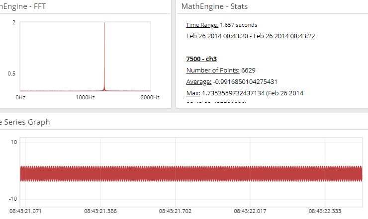 Simply zoom in to the data of interest on your Timeseries graph, press the MathEngine button, and select the operation you wish to perform. Easily create a fully interactive FFT, or get statistics such as number of points, average, max, min, peak-to-peak, RMS, and standard deviation.